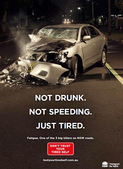 Coraz więcej mówi się też w mediach o zmęczeniu i jego skutkach. Publiczne kampanie edukacyjne i społeczne są obecnie jedynym sposobem radzenia sobie ze zmęczeniem kierowców i motocyklistów. Spójrzcie na plakat jednej z takich kampanii zorganizowanej przez Transport for New South Wales. Zajrzyjcie też tutaj i zapoznajcie się z filmikiem tej kampanii, a może macie ochotę zrobić sobie test dotyczący Waszego zmęczenia. Jest TU.