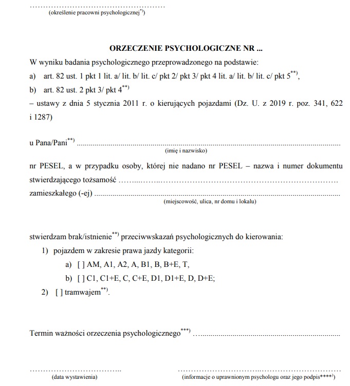Zmiana weszła rozporządzeniem Ministra Zdrowia z dnia 3 lipca 2019 r. Opublikowano je 12 lipca, a obowiązuje od 13 lipca. Orzeczenia psychologiczne wydane przed dniem wejścia w życie niniejszego rozporządzenia zachowują ważność przez okres, na jaki zostały wydane. Natomiast już wczoraj powinniście wydawać orzeczenia na nowym druku. Wiem, że niektórych powiadamiało Starostwo, ale sporo osób nic nie wiedziało o zaistniałej zmianie. Zresztą na portalu medycyny pracy wpis o zmianie również pojawił się dopiero wczoraj. Co się zmienia?